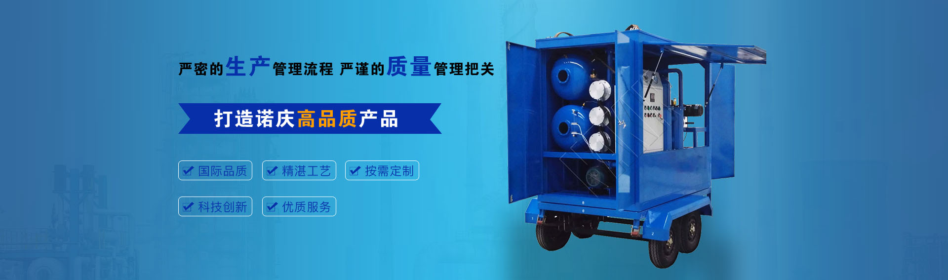 公司通過ISO9001-2015質(zhì)量管理體系認(rèn)證,CE歐盟認(rèn)證,諾慶公司所有濾油機(jī)配套產(chǎn)品均采用國內(nèi)外知名品牌,經(jīng)過多年的使用,具有質(zhì)量可靠,性能優(yōu)良。公司擁有完備的檢測儀器和檢測設(shè)備,所有產(chǎn)品出廠前經(jīng)過嚴(yán)格測試,保證每一臺產(chǎn)品合格出廠。